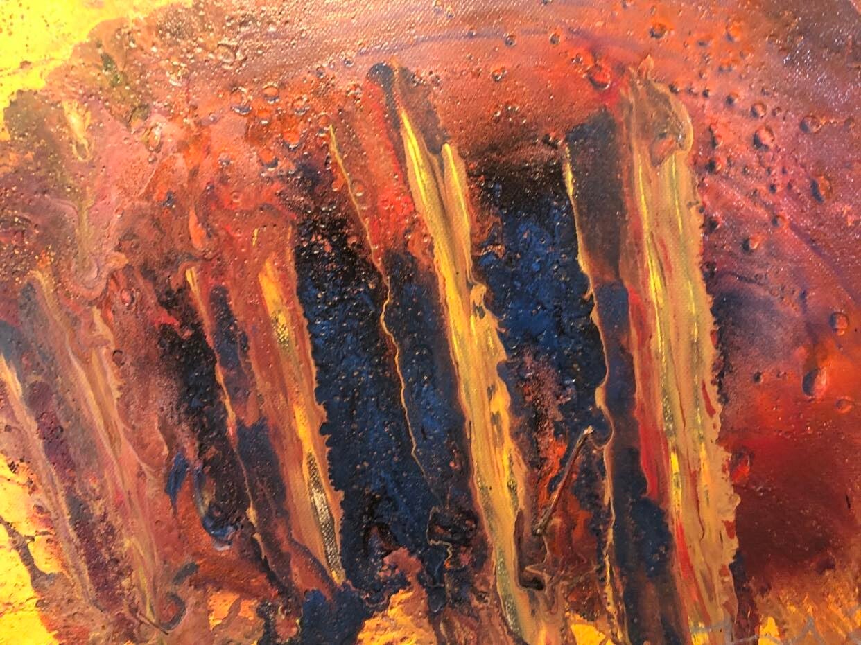 Medium: Spray Paints, Rain, and Leaves Used As Brushes on a 11"x14" Framed and Gessoed Canvas